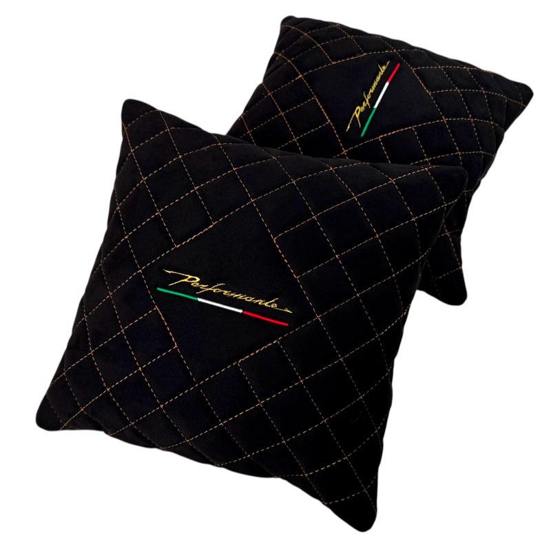 Verleihen Sie Ihrem Huracan Performante mit einem Set aus zwei handgefertigten Kissen aus schwarzem Alcantara das gewisse Etwas. Jedes Stück wird mit Präzision von Hand gefertigt und mit einem einzigartigen Nahtdesign versehen, das sowohl Eleganz als auch Rennsportgeist zum Ausdruck bringt.