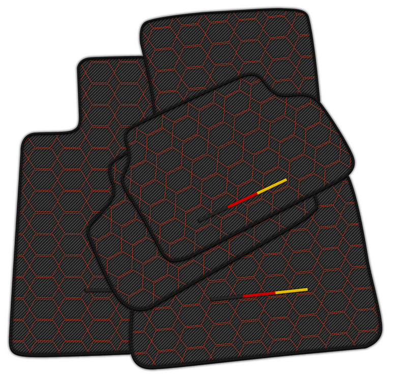 Werten Sie Ihren BMW mit unseren Carbonfaser-Fußmatten auf. Mit ihrem eleganten Sechseckmuster, roten Nähten und der deutschen Flagge vereinen diese Fußmatten Stil und Funktionalität. Hergestellt aus hochwertigem Carbonfasermaterial bieten sie höchste Haltbarkeit und Schutz für den Boden Ihres Fahrzeugs.