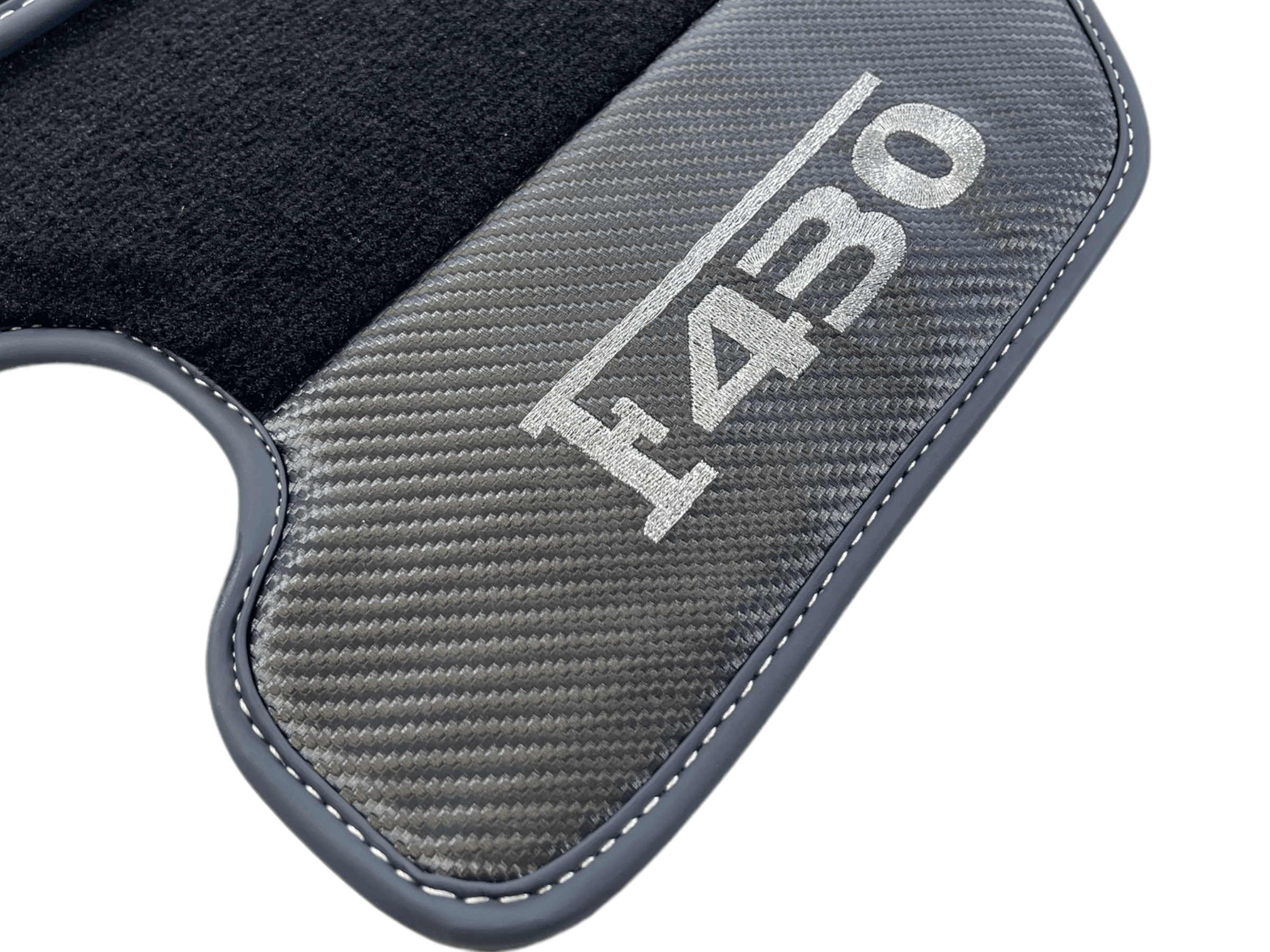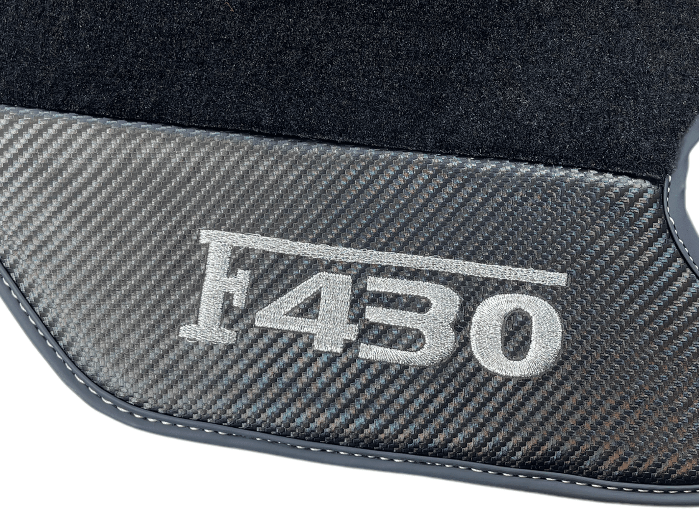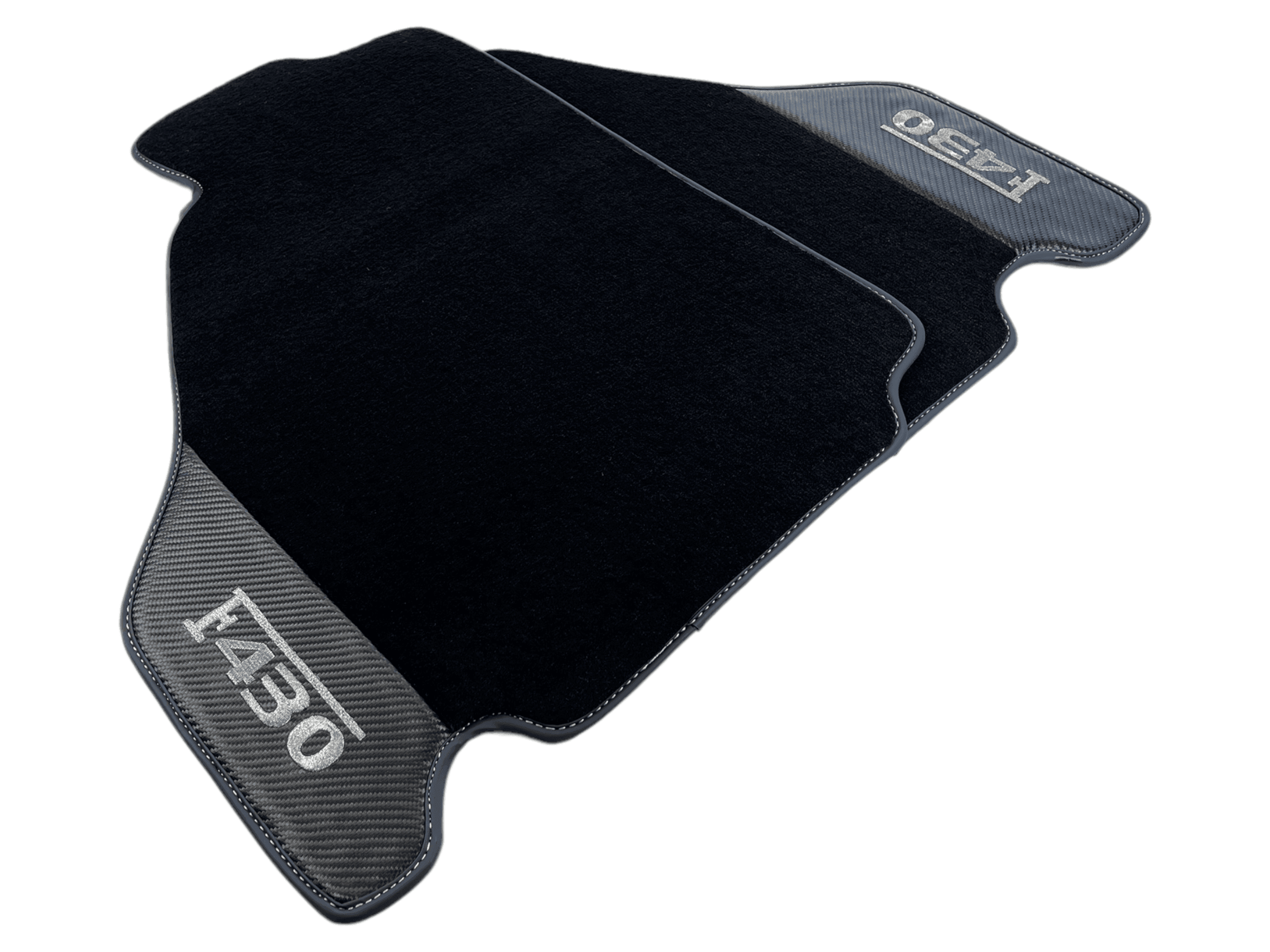Tappetini neri per auto Ferrari F430 2004-2009 con pelle in fibra di carbonio